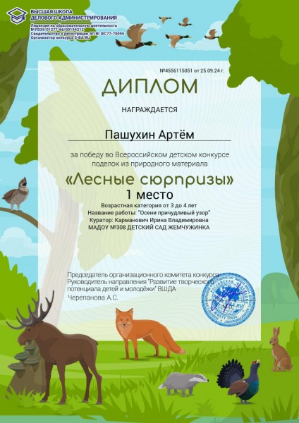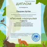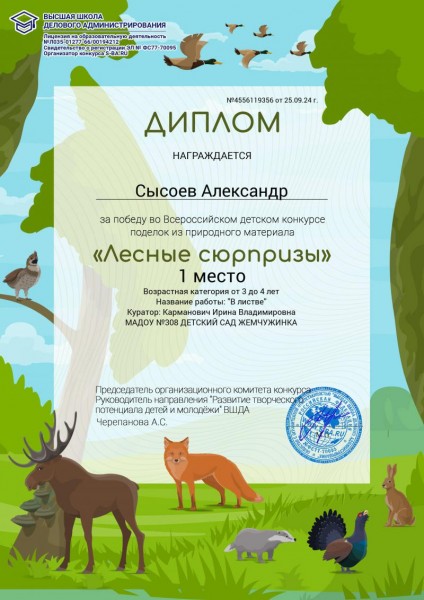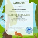 Воспитанники нашей группы приняли участие во Всероссийском детском конкурсе поделок из природного материала "Лесные сюрпризы" и заняли призовые места!